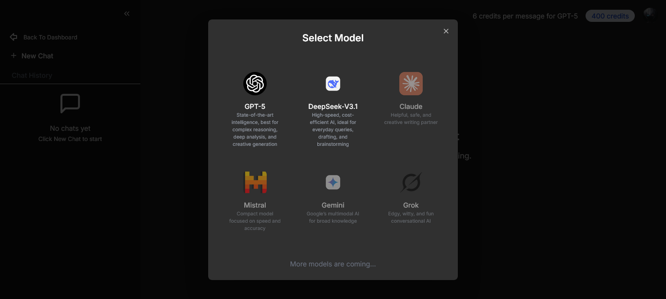 - Stripe Payments Integration: Implemented a credit-based system allowing users to purchase credits and use them seamlessly across multiple AI models.