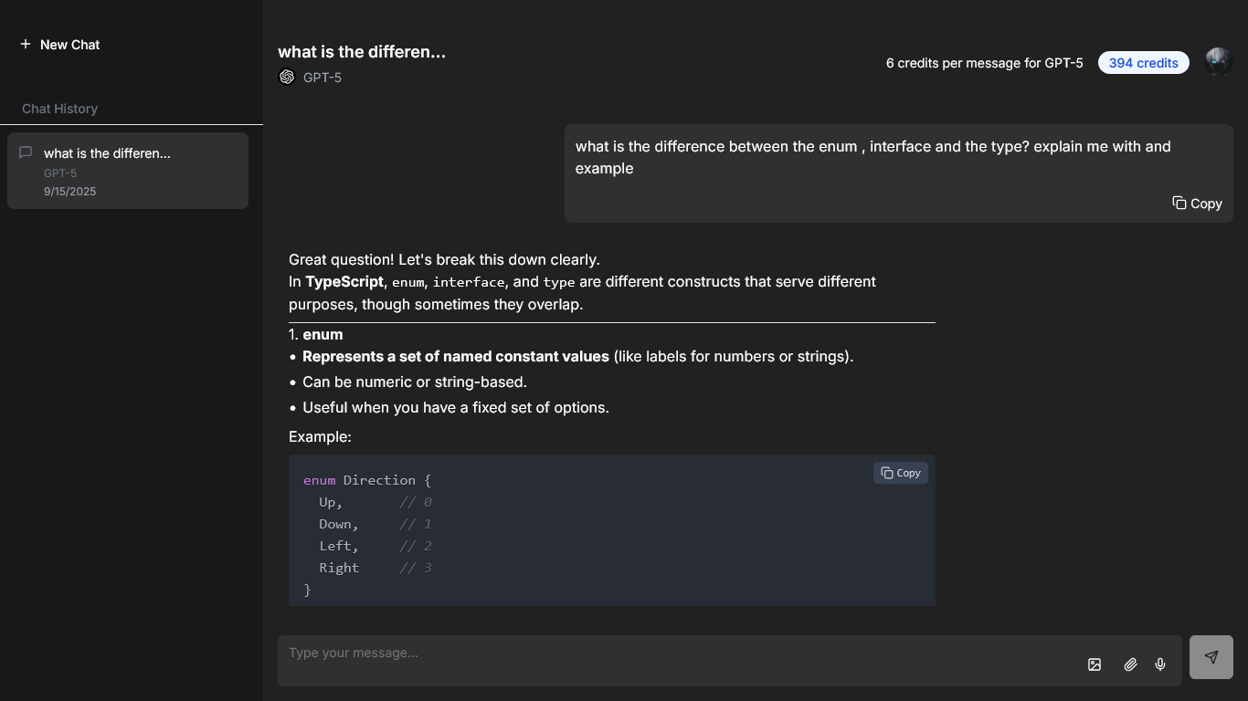 - Interactive Chat Page: Built a dynamic chat interface for users to send queries to AI models and receive real-time responses.